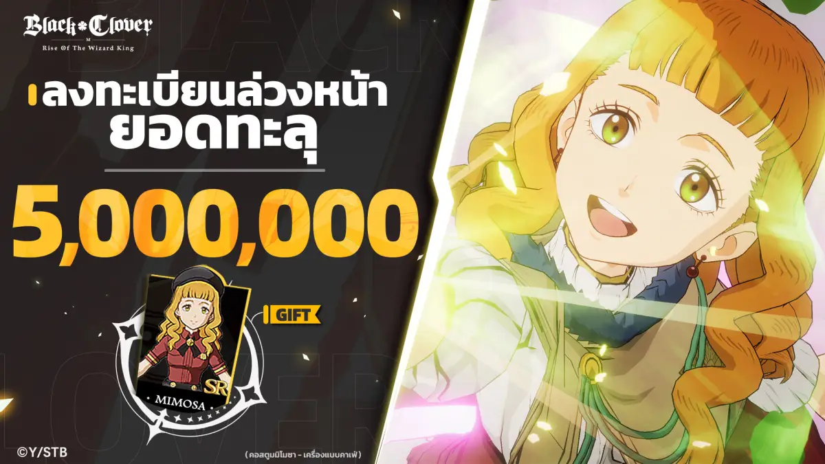 เพื่อเป็นการฉลองการลงทะเบียนล่วงหน้าทั่วโลกครบ 2.5 ล้าน และ 5 ล้านคน การีนาขอมอบตัวละครที่สามารถรับได้เมื่อเปิดตัวเกมให้กับผู้ลงทะเบียนทุกคน — ตัวละครจอมเวทคลาสฮีลเลอร์ มิโมซา ระดับ SR พร้อมด้วยคอสตูมสุดพิเศษอย่าง เครื่องแบบคาเฟ่ โดยชุดสุดแสนน่ารักนี้ไม่เคยปรากฏในซีรีส์ “Black Clover” หรือในอนิเมะที่ไหนมาก่อน ออกแบบมาเพื่อ Black Clover M โดยเฉพาะ!