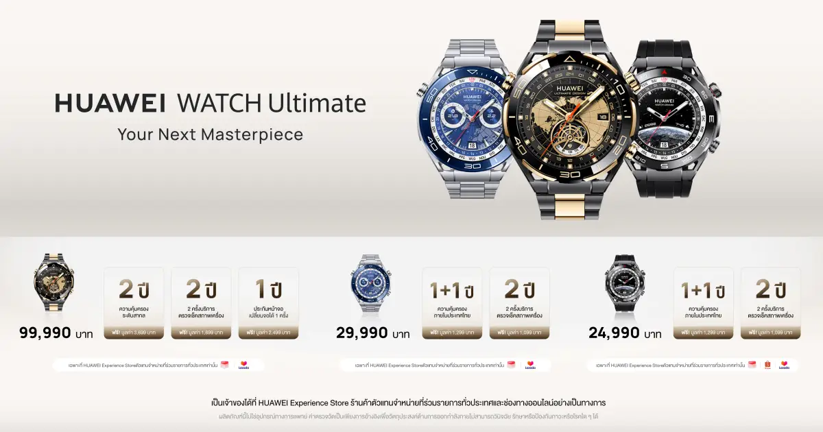 - HUAWEI WATCH ULTIMATE DESIGN วางจำหน่ายในราคา 99,990 บาท เฉพาะที่ HUAWEI Experience Store ที่ร่วมรายการทั่วประเทศเท่านั้น รวมทั้งร้านค้าอย่างเป็นทางการของหัวเว่ยบนแพลตฟอร์มออนไลน์ Lazada พร้อมรับฟรี! บริการความคุ้มครองระดับสากล 2 ปี มูลค่า 3,699 บาท บริการตรวจเช็คสภาพเครื่อง 2 ครั้งในระยะเวลา 2 ปี มูลค่า 1,699 บาท และการดูแลหน้าจอเปลี่ยนจอได้ 1 ครั้ง ในระยะเวลา 1 ปี มูลค่า 2,499 บาท