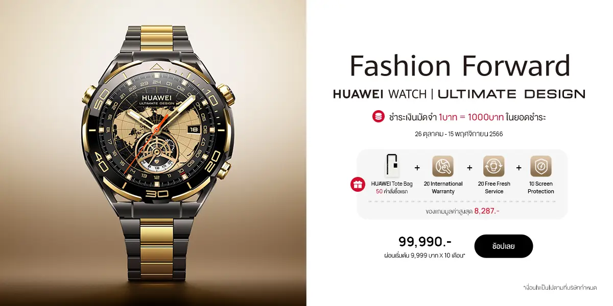 - HUAWEI WATCH ULTIMATE DESIGN วางจำหน่ายในราคา 99,990 บาท ที่ร้านค้าอย่างเป็นการของหัวเว่ยบน Lazada สำหรับออเดอร์แรก รับฟรี! HUAWEI MatePad T 8.0 WIFI มูลค่า 3,290 บาท บริการความคุ้มครองระดับสากล 2 ปี มูลค่า 3,699 บาท การดูแลหน้าจอเปลี่ยนจอได้ 1 ครั้ง ในระยะเวลา 1 ปี มูลค่า 2,499 บาท และบริการตรวจเช็คสภาพเครื่อง 2 ครั้งในระยะเวลา 2 ปี มูลค่า 1,699 บาท