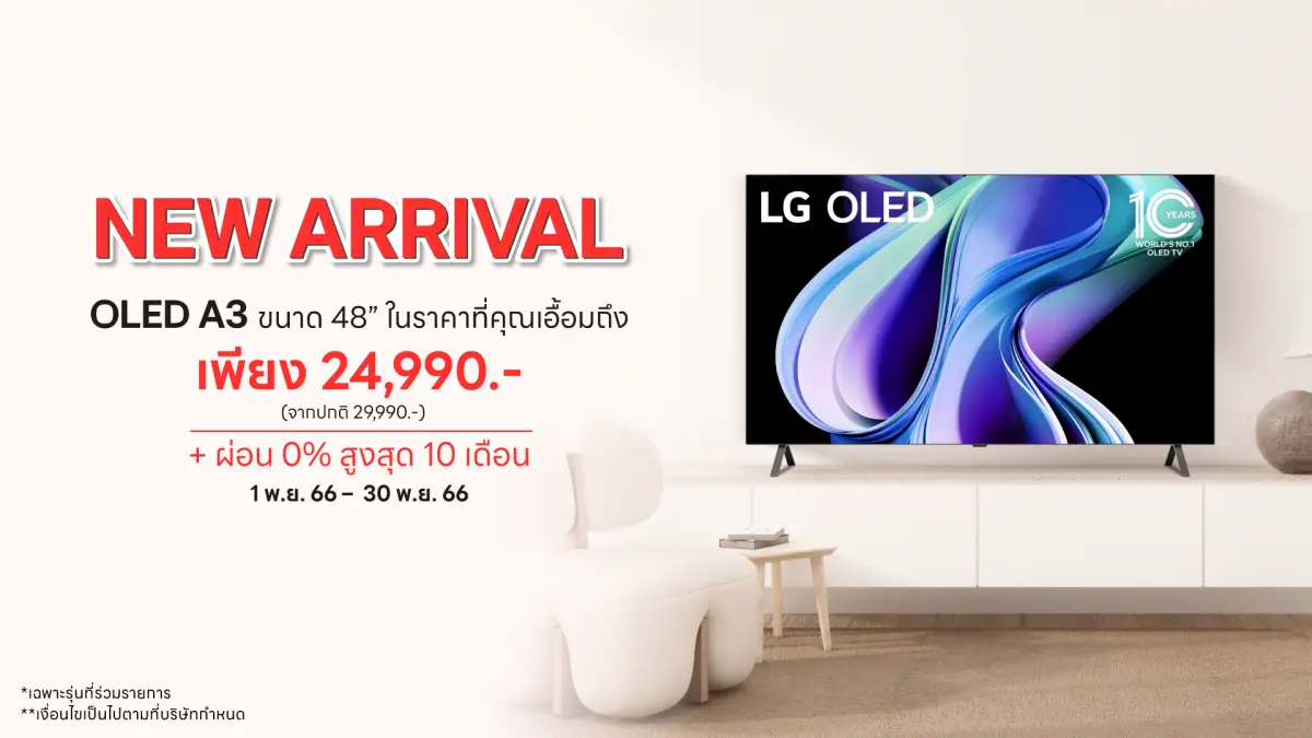 - LG OLED 4K ซีรีส์ A3 ขนาด 48 นิ้ว ราคา 24,990 บาท จากราคาปกติ 29,990 บาท พร้อมรับโปรโมชันผ่อน 0% นาน 10 เดือน