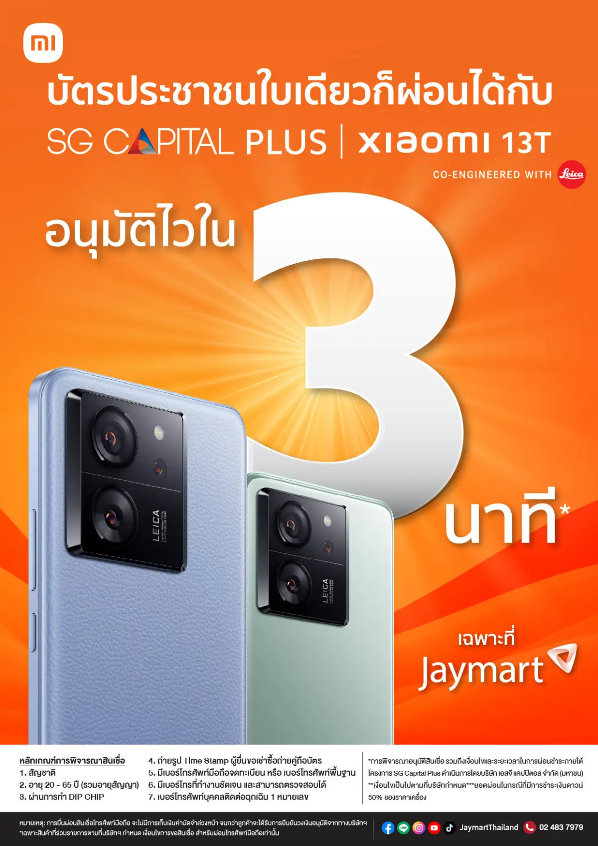 เจมาร์ท (Jaymart) ซิงเกอร์ (SINGER) และเอสจี แคปปิตอล (SG Capital) ร่วมมือกับเสียวหมี่ (Xiaomi) ออกแคมเปญพิเศษ ‘SG CAPITAL PLUS l Xiaomi 13T’ ให้ผู้ที่สนใจเป็นเจ้าของ Xiaomi 13T ได้ง่ายยิ่งขึ้น โดยไม่ต้องใช้บัตรเครดิต เพียงใช้แค่บัตรประชาชนใบเดียว ก็สามารถเริ่มต้นผ่อนได้เพียงเดือนละ 440 บาท นานสูงสุด 24 เดือน นอกจากนี้ยังทราบผลอนุมัติไวใน 3 นาทีอีกด้วย1