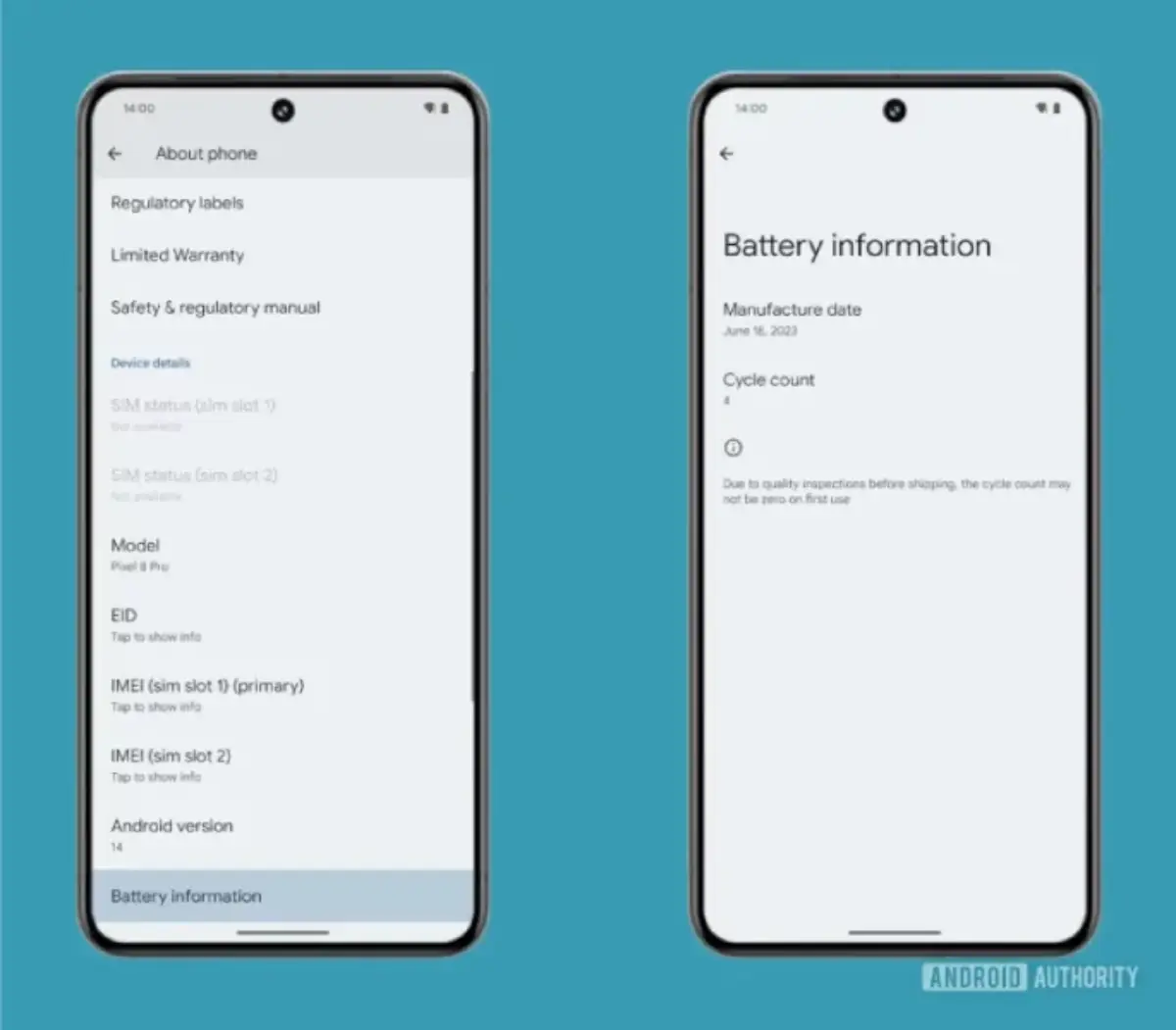 Pixel Feature Drop ล่าสุดได้เปิดตัวหน้าจอ “ข้อมูลแบตเตอรี” ซึ่งเปิดเผยจำนวนรอบของแบตเตอรีและวันที่ผลิต นอกจากนี้ Android 14 ยังเสริมศักยภาพให้กับนักพัฒนาบุคคลที่สามด้วย API แบตเตอรี ที่ช่วยให้แอปสามารถประเมินความสมบูรณ์ของแบตเตอรีได้ ซึ่งขั้นตอนเหล่านี้ดูเหมือนจะเป็นการปูทางไปสู่ฟีเจอร์จอสุขภาพแบตเตอรี