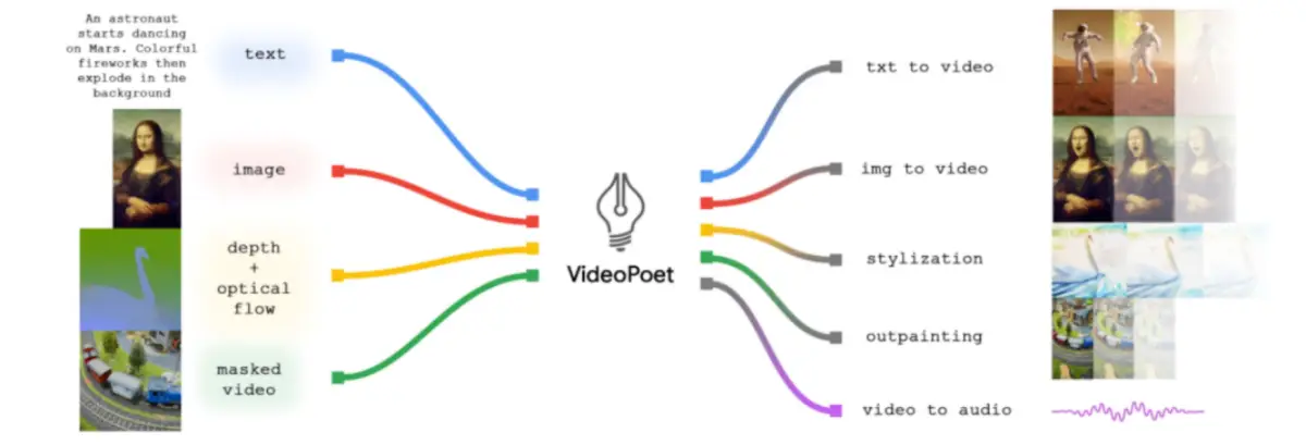 Google เปิดตัว VideoPoet ซึ่งเป็นโมเดลภาษาขนาดใหญ่ (LLM) ที่สามารถสร้างคลิป 10 วินาทีได้ โมเดลดังกล่าวรองรับงานการสร้าง วิดีโอ ที่หลากหลาย รวมถึงการแปลงข้อความเป็นวิดีโอ การแปลงรูปภาพเป็นวิดีโอ การปรับแต่งสไตล์วิดีโอ การลงสี และฟังก์ชันวิดีโอเป็นเสียง