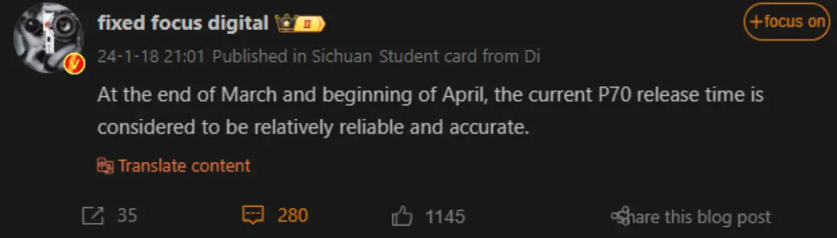 จากข้อมูลของ Tipster บน Weibo อ้างว่ายักษ์ใหญ่ด้านเทคโนโลยีของจีนกำลังวางแผนที่จะเปิดตัวซีรีส์ P70 ที่เป็น สมาร์ตโฟนเรือธง ประมาณปลายเดือนมีนาคม 2024 หรือต้นเดือนเมษายน 2024 และยังเสริมอีกว่าแหล่งที่มาของไทม์ไลน์การเปิดตัวนั้นเชื่อถือได้ อย่างไรก็ตามข้อมูลที่ว่านี้ยังไม่ได้รับการยืนยันแต่อย่างใด