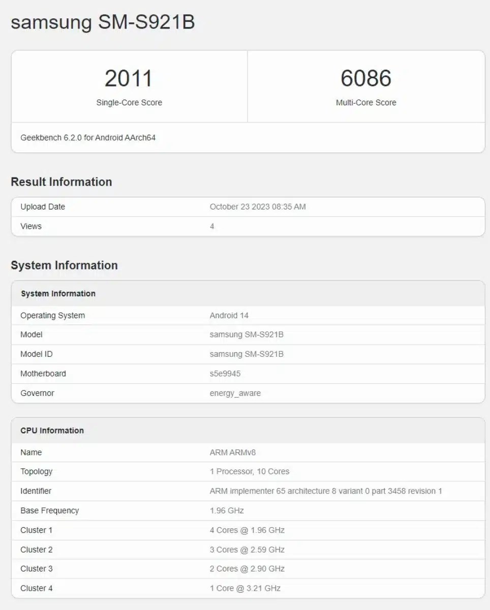 - Exynos 2400 : Single-core = 2067, Multi-core = 6520
