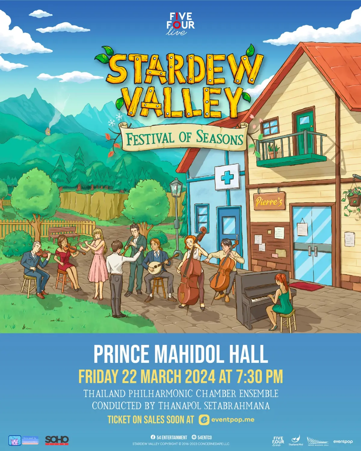 คอนเสิร์ต Stardew Valley: Festival of Seasons ในประเทศไทย จะจัดขึ้นในวันศุกร์ที่ 22 มีนาคม 2024 เวลา 19:30 ณ มหิดลสิทธาคาร บรรเลงเพลงประกอบของเกมโดยวง Thailand Philharmonic Chamber Ensemble