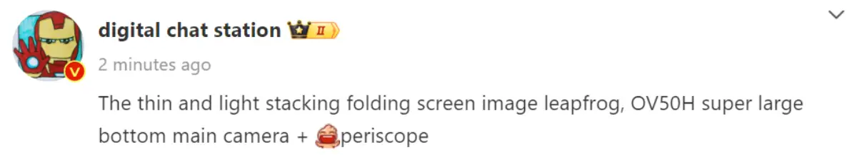 จากข้อมูลที่แชร์มาเหมือนว่า Tipster จะพูดถึงสมาร์ตโฟนแบบพับได้ที่คาดว่าจะมีรูปทรงที่บางและเบา ทำให้เดาไปว่าน่าจะหมายถึง vivo X Fold 3 และกล่าวว่าจะประกอบด้วยกล้องหลัก OmniVision OV50H และเลนส์ Periscope Telephoto
