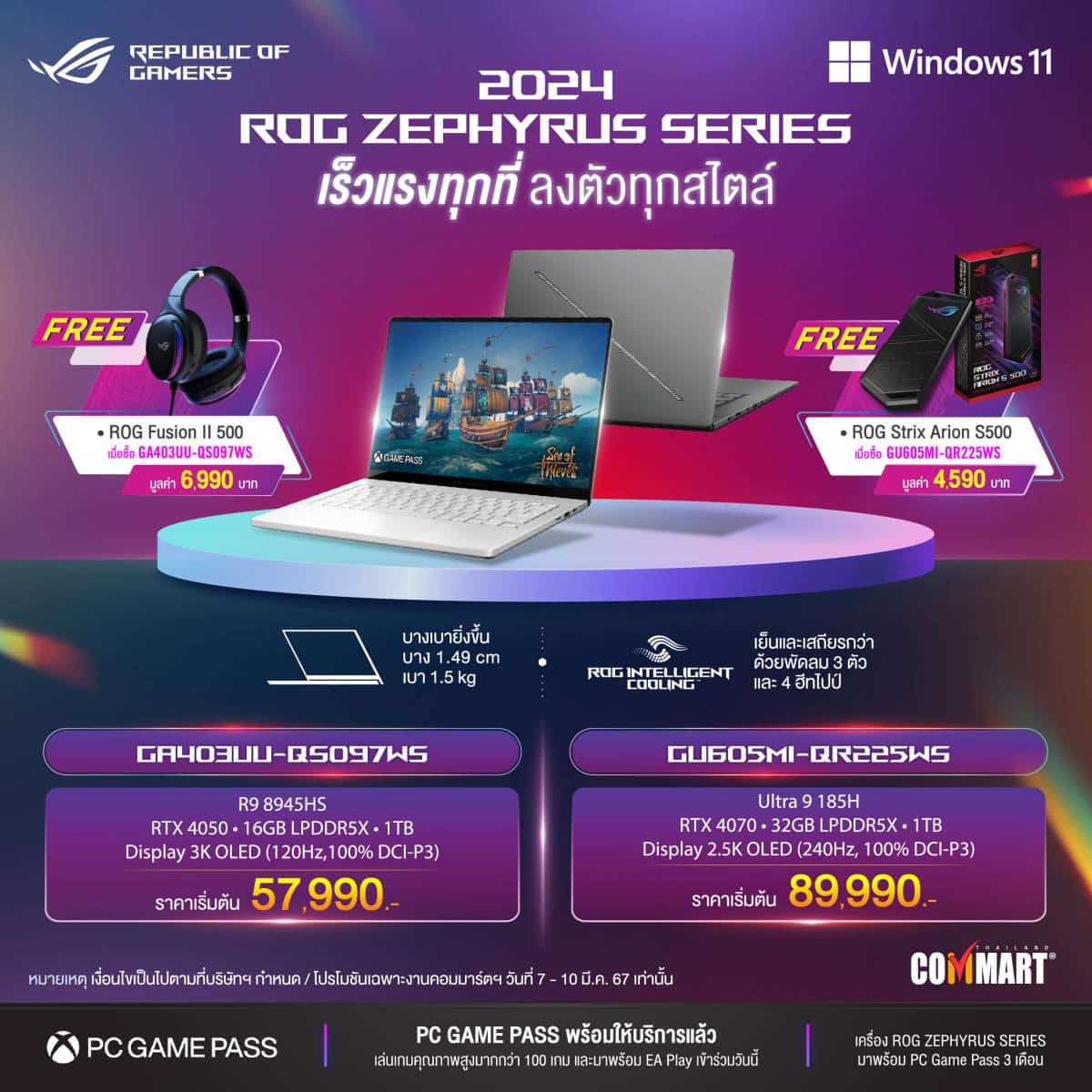 ทรงพลังแต่บางเบา พกพาได้อย่างมีสไตล์ด้วย ROG Zephyrus G series 2024 ที่มีน้ำหนักตัวเพียง 1.5 กก. และบางเพียง 1.59 ซม. ในขนาดหน้าจอ 14 นิ้ว บน Zephyrus G14 2024 ขณะที่ Zephyrus G16 2024 ที่มีหน้าจอขนาดหน้าจอ 16 นิ้ว นั้นมีน้ำหนักเพียง 1.85 กก. และบางเพียง 1.49 ซม. ไม่เพียงแต่มีความบางเบาที่โดดเด่น ROG Zephyrus G series 2024 ยังมาพร้อมดีไซน์ใหม่และวัสดุคุณภาพระดับพรีเมียม และยังมาพร้อมหน้าจอเกรดคุณภาพสูงสุดอย่าง ROG Nebula Display ที่ใช้เทคโนโลยีหน้าจอแบบ OLED โดดเด่นในเรื่องการแสดงผลสีที่จัดจ้าน ให้สีดำที่ดำสนิท มีความเที่ยงตรงระดับ 100% DCI-P3 รีเฟรชเรทสูงสุด 240Hz โดยมีสองขนาดหน้าจอให้เลือกใช้งานทั้ง 14 นิ้ว (Zephyrus G14) และ 16 นิ้ว (Zephyrus G16) จึงทำให้เป็นหน้าจอที่สมบูรณ์แบบสำหรับการใช้งานรอบด้าน ทั้งหมดนี้ถูกขับเคลื่อนด้วยขุมพลังโปรเซสเซอร์ระดับไฮเอนด์ที่ถูกเสริมประสิทธิภาพด้วยพลังประมวลผล AI จากทั้ง AMD Ryzen™ 9 8945HS ใน Zephyrus G14 และ Intel® Core™ Ultra 9 Processor 185H ใน Zephyrus G16 กราฟิกการ์ดทรงพลังสูงสุดถึงระดับ Nvidia GeForce RTX 4070 สมบูรณ์แบบสำหรับการพกพาไปใช้งานระดับสูงได้ในทุกที่ เป็นเจ้าของ ROG Zephyrus series ได้ที่ราคาเริ่มต้นเพียง 41,990 บาท พิเศษ! รับเพิ่มหูฟังเกมมิ่ง ROG Fusion II 500 มูลค่า 6,990 บาท เมื่อซื้อ ROG Zephyrus G14 รุ่นใดก็ได้ หรือรับเพิ่ม WD Green 500 GB SSD มูลค่า 1,390 บาท เมื่อซื้อ ROG Zephyrus G16/M16 รุ่นใดก็ได้