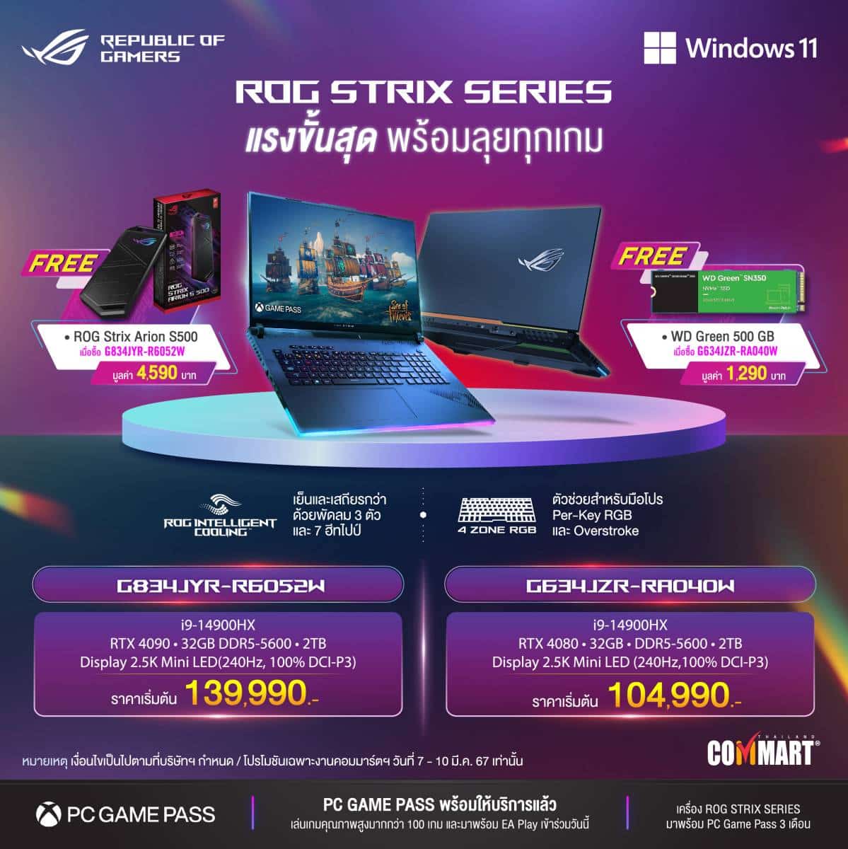 นอกจากนั้นแล้วยังมี ROG Strix G16/18 ที่แรงจัดเต็มพร้อมลุยทุกเกม ด้วยชิปประมวลผลรุ่นท็อปสุดอย่าง Intel® Core™ i9 processor 14900HX กราฟิกการ์ดระดับไฮเอนด์สูงสุดถึง Nvidia GeForce RTX 4070 และ RAM แบบ DDR5 บัสความเร็ว 5600 MHz ขนาดใหญ่สูงสุดถึง 32GB ระบบระบายความร้อนอัจฉริยะ ROG Intelligent Cooling ที่ได้รับการปรับปรุงให้ดียิ่งขึ้นกว่าเดิมด้วยสารระบายความร้อนแบบโลหะเหลวจาก Thermal Grizzly พร้อมชุดฮีทซิ้งค์ขนาดใหญ่แบบใหม่ที่ทอดตัวตามแนวยาวตลอดด้านหลังของตัวเครื่องและพัดลมระบายความร้อน Arc Flow Fans ที่มีมาให้มากถึงสามตัว ทำให้การเล่นเกมทำได้ลื่นไหลเต็มประสิทธิภาพ ROG Strix G series มีสองขนาดหน้าจอให้เลือกซื้อไม่ว่าจะเป็น 16 หรือ 18 นิ้ว ในราคาเริ่มต้นเพียง 49,990 บาท พิเศษ! รับเพิ่ม WD Green 500 GB SSD มูลค่า 1,390 บาท เมื่อซื้อ ROG Strix G16/18 รุ่นใดก็ได้