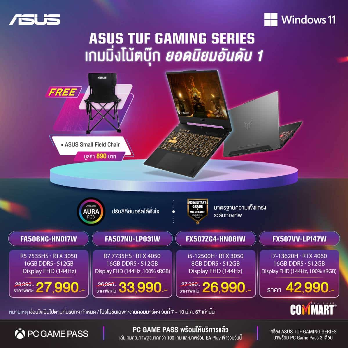 พร้อมลุยทุกสมรภูมิด้วยเกมมิ่งโน้ตบุ๊กสุดแกร่ง TUF Gaming Series ที่ผ่านมาตรฐานการทดสอบความทนทานของกองทัพสหรัฐฯ MIL-STD 810H ไม่ว่าจะเป็น TUF Gaming A15/A16 หรือ F15/F17 ที่มีสเปคให้เลือกใช้งานหลากหลายตั้งแต่การใช้งานระดับเริ่มต้นไปจนถึงสเปคระดับไฮเอนด์ที่พร้อมรับมือทุกเกมโหด สเปคสูงสุดถึงระดับ AMD Ryzen 9 8945H ที่จับคู่กับ Nvidia GeForce RTX 4070 โดยสามารถเป็นเจ้าของ TUF Gaming Series ได้ง่ายๆที่ราคาเริ่มต้นเพียง 22,990 บาท พิเศษ! รับเพิ่ม ASUS Small Field Chair มูลค่า 890 บาท เมื่อซื้อเกมมิ่งโน้ตบุ๊ก TUF Gaming Series รุ่นใดก็ได้