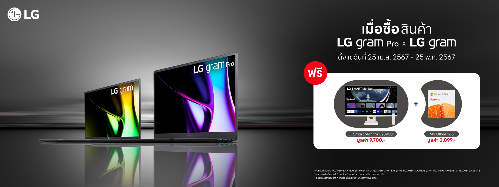 LG บอกโปรฯ สุดคุ้มเมื่อซื้อแล็ปท็อป LG gram และ LG gram Pro รุ่นใหม่ล่าสุดประจำปี 2024 รับฟรี LG Smart Monitor รุ่น 32SR50F ขนาด 32 นิ้ว มูลค่า 9,700 บาท ให้ไปเสริมมุมมองการใช้งานแล็ปท็อปเพื่อการทำงานและความบันเทิงอย่างครบครัน และรับฟรี Microsoft Office 365 มูลค่า 2,099 บาท โปรโมชันสุดพิเศษนี้สำหรับผู้ที่ซื้อตั้งแต่วันที่ 25 เมษายน – 25 พฤษภาคม 2567 เท่านั้น* ทางเว็บไซต์ www.lg.com ร้านค้าตัวแทนจำหน่าย หรือช่องทางออนไลน์ทั้ง Lazada และ Shopee ดูรายละเอียดเพิ่มเติมเกี่ยวกับโปรโมชั่นได้ที่ https://www.lg.com/th/promotions/2024_free_smartmnt/