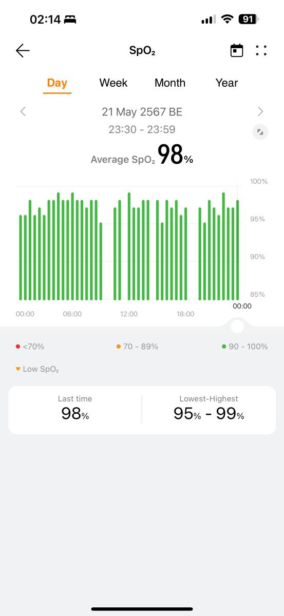 • วัดระดับออกซิเจนในเลือด (SpO2): ฟีเจอร์นี้มีประโยชน์อย่างมากในการติดตามสุขภาพโดยรวม โดยเฉพาะสำหรับผู้ที่มีปัญหาเกี่ยวกับระบบหายใจ