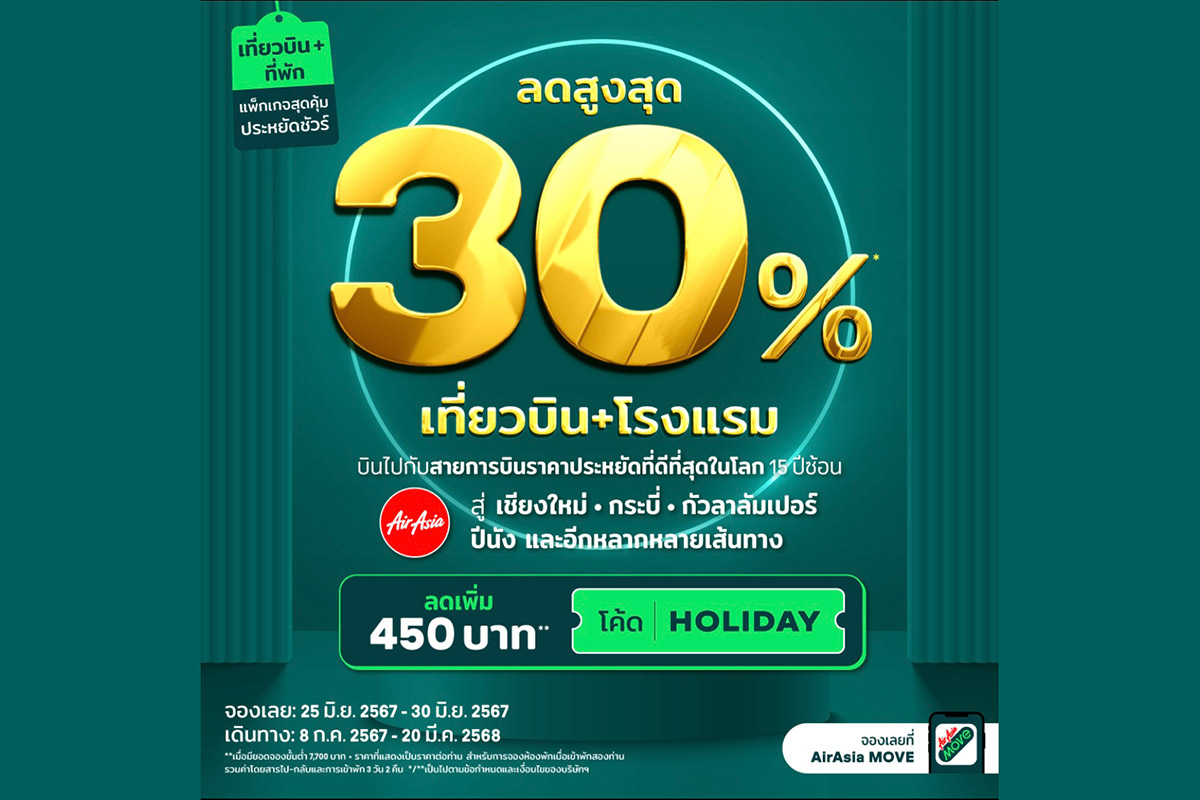 เพื่อตอบสนองเทรนด์ดังกล่าว AirAsia MOVE ได้จัดโปรโมชั่นพิเศษ ลดราคาแพ็กเกจเที่ยวบิน+โรงแรมสูงสุดถึง 30% พร้อมส่วนลดเพิ่มเติม 450 บาท สำหรับการจองขั้นต่ำ 7,700 บาท โดยใช้รหัสส่วนลด [HOLIDAY] โปรโมชั่นนี้มีระยะเวลาจองตั้งแต่วันที่ 25-30 มิถุนายน 2567 สำหรับการเข้าพักระหว่างวันที่ 8 กรกฎาคม 2567 ถึง 20 มีนาคม 2568