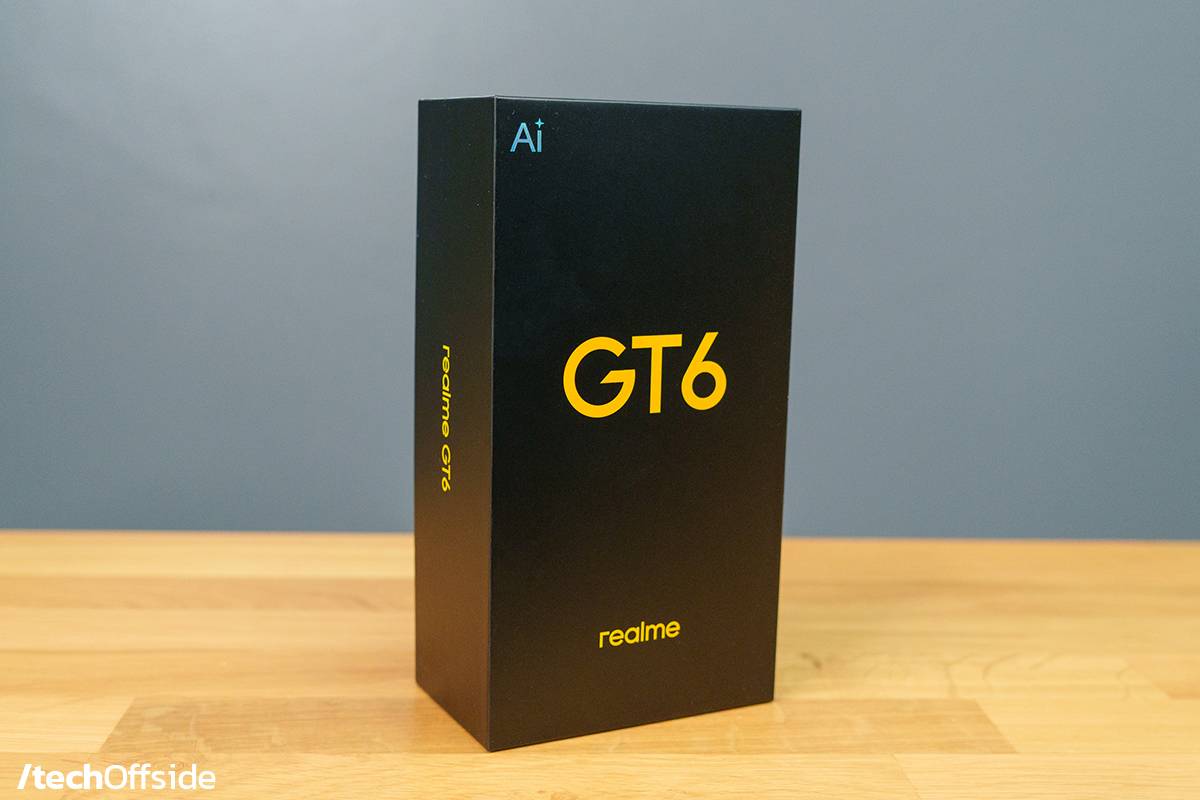 ตัวแพ็กเกจของ realme GT6 จะแตกต่างจากรุ่นอื่นๆ ของเรียลมี โดยตัวกล่องจะเป็นสีดำสนิท และตัวอักษรชื่อของแบรนด์และรุ่นจะเป็นสีเหลือง และมีความพิเศษกับคำว่า “AI” ที่มุมซ้ายบนของกล่อง ที่บอกว่า สมาร์ทโฟนรุ่นนี้มี AI มาในระบบเรียบร้อยแล้ว