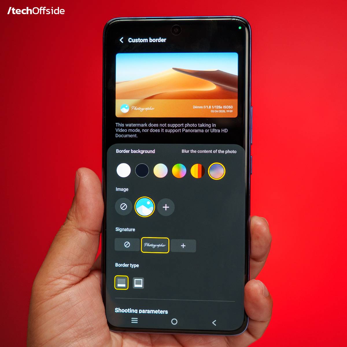 รวมถึงยังใส่ใจรายละเอียดในการปรับแต่งกรอบภาพลายน้ำที่เรียกได้ว่า ปรับได้เยอะและอิสระที่สุดในทุกแบรนด์ที่มีตอนนี้ เพราะไม่ใช่แค่เปลี่ยนสีเปลี่ยนรูปแบบ แต่เลือกเปลี่ยนสีกรอบตามโทนภาพให้อัตโนมัติ ไปจนถึงเปลี่ยนไอคอนและลายน้ำเป็นภาพของเราเองได้ ทำให้คุณถ่ายภาพแล้วได้เฟรมสวยๆ พร้อมแชร์ได้โดยไม่ต้องไปใส่ไปจัดในแอปอื่นให้เสียเวลา